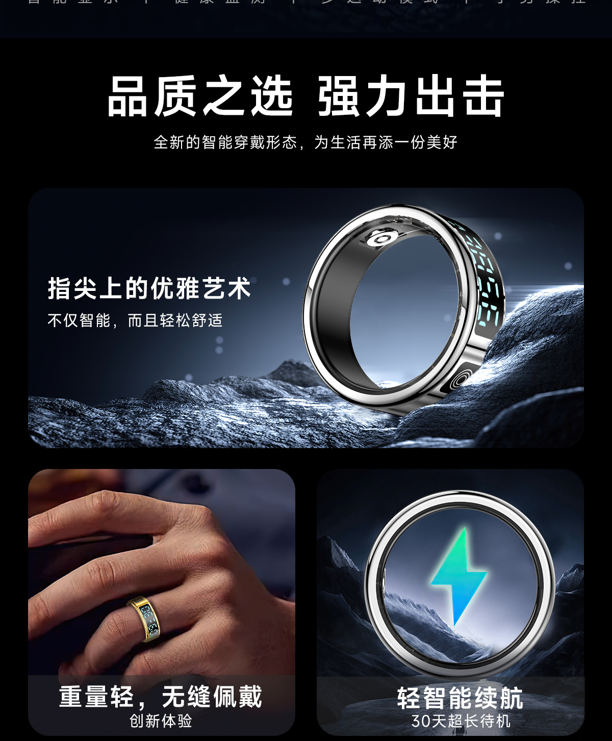 30+ styles, smart rings can be selected from stainless steel, aluminum alloy, ceramic, titanium alloy, gold, Vietnamese sand gold, diamond inlay, carbon fiber